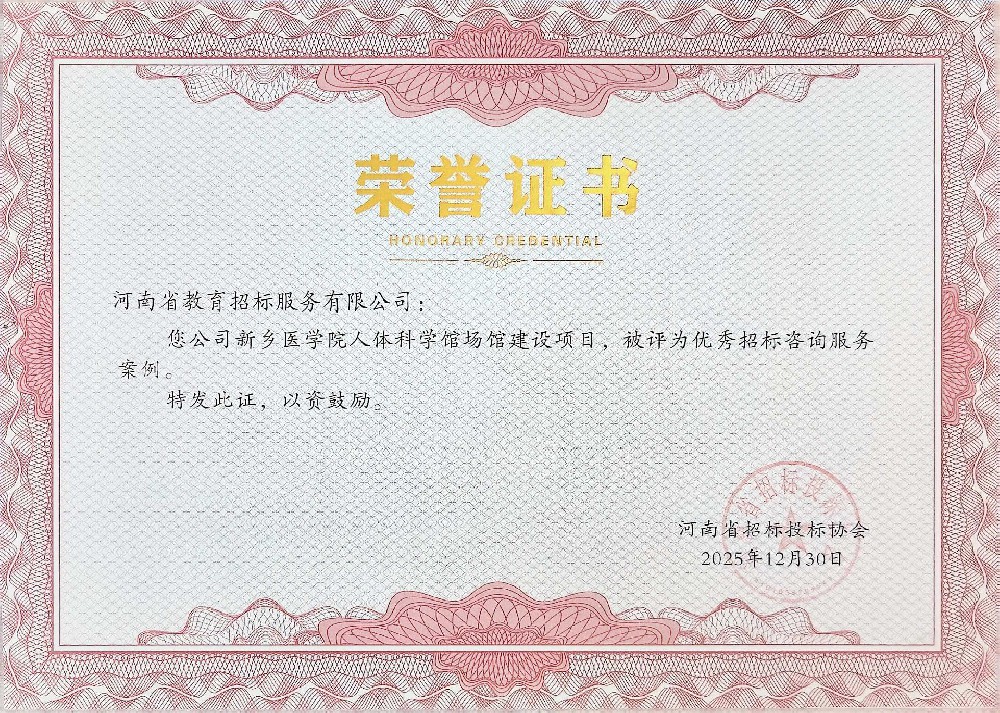 河南省教育招標(biāo)服務(wù)有限公司在河南省招標(biāo)投標(biāo)協(xié)會(huì)2025 年優(yōu)秀招標(biāo)咨詢服務(wù)案例評(píng)選活動(dòng)中,【新鄉(xiāng)醫(yī)學(xué)院人體科學(xué)館場(chǎng)館建設(shè)】項(xiàng)目被評(píng)為“優(yōu)秀招標(biāo)咨詢服務(wù)案例”。榮譽(yù)證書(shū)的獲得,是行業(yè)對(duì)我司專業(yè)能力和服務(wù)水平的高度認(rèn)可,更是未來(lái)前行的動(dòng)力。我司將繼續(xù)秉持專業(yè)精神,持續(xù)打磨服務(wù)能力,不斷探索行業(yè)前沿技術(shù)與服務(wù)模式,為更多客戶提供高質(zhì)量、定制化的招標(biāo)咨詢解決方案,助力行業(yè)規(guī)范化、高質(zhì)量發(fā)展!